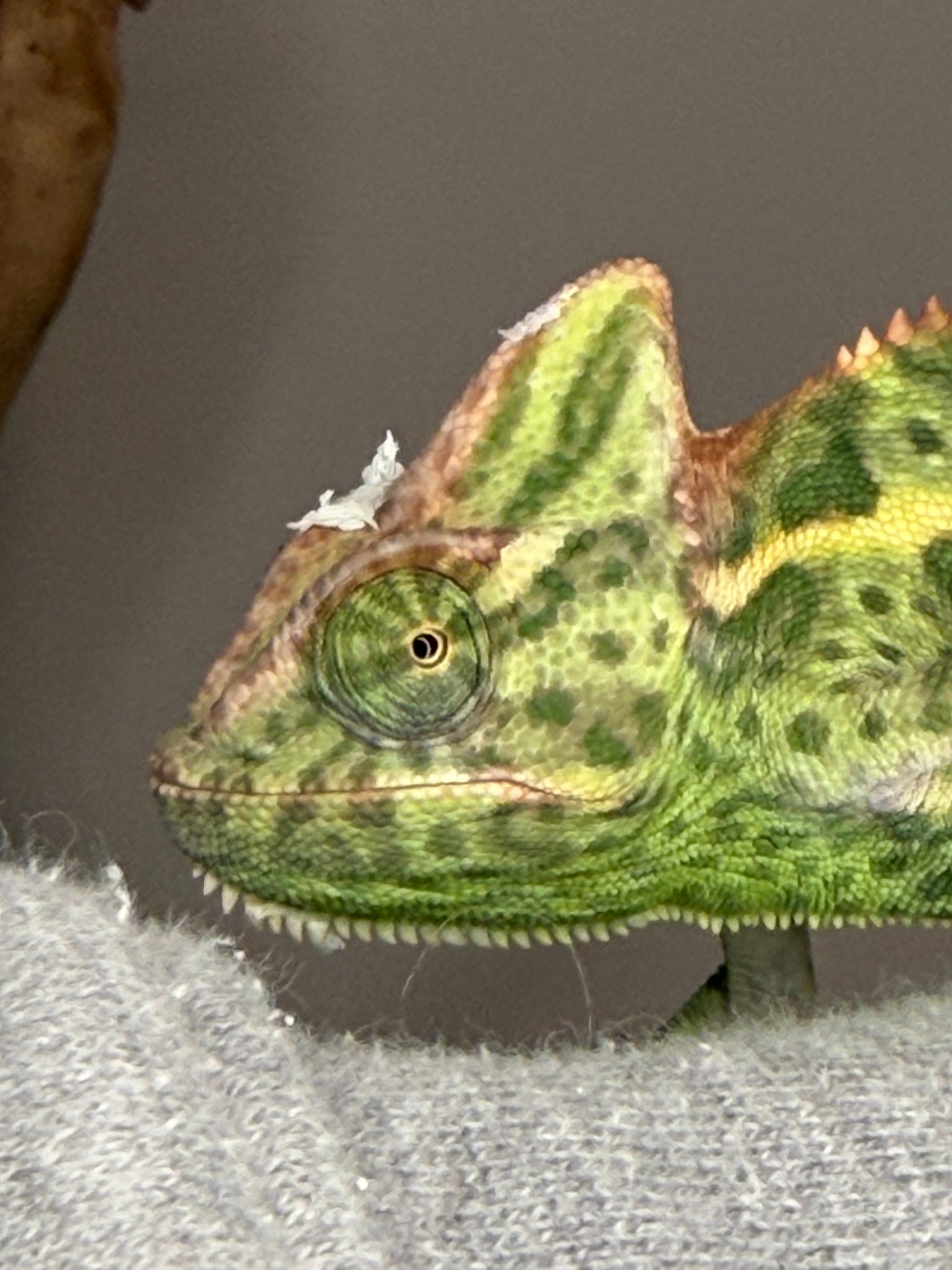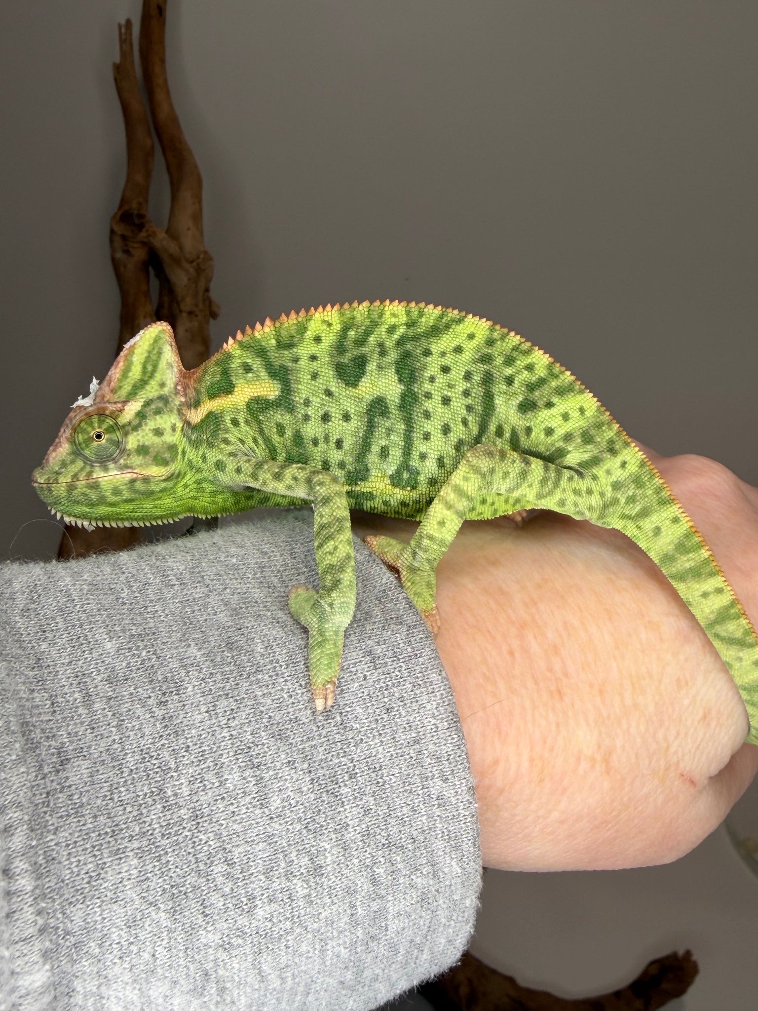 Looking for a sweet, easygoing Veiled Chameleon? This young female is notably calm, observant, and gentle in her demeanor, making her a wonderful choice for someone looking for a more relaxed veiled. She enjoys watching her surroundings, moves confidently through her enclosure, and handles routine care with ease. When you bring her home, this is the exact chameleon you’ll receive—healthy, well-started, and thoughtfully raised.