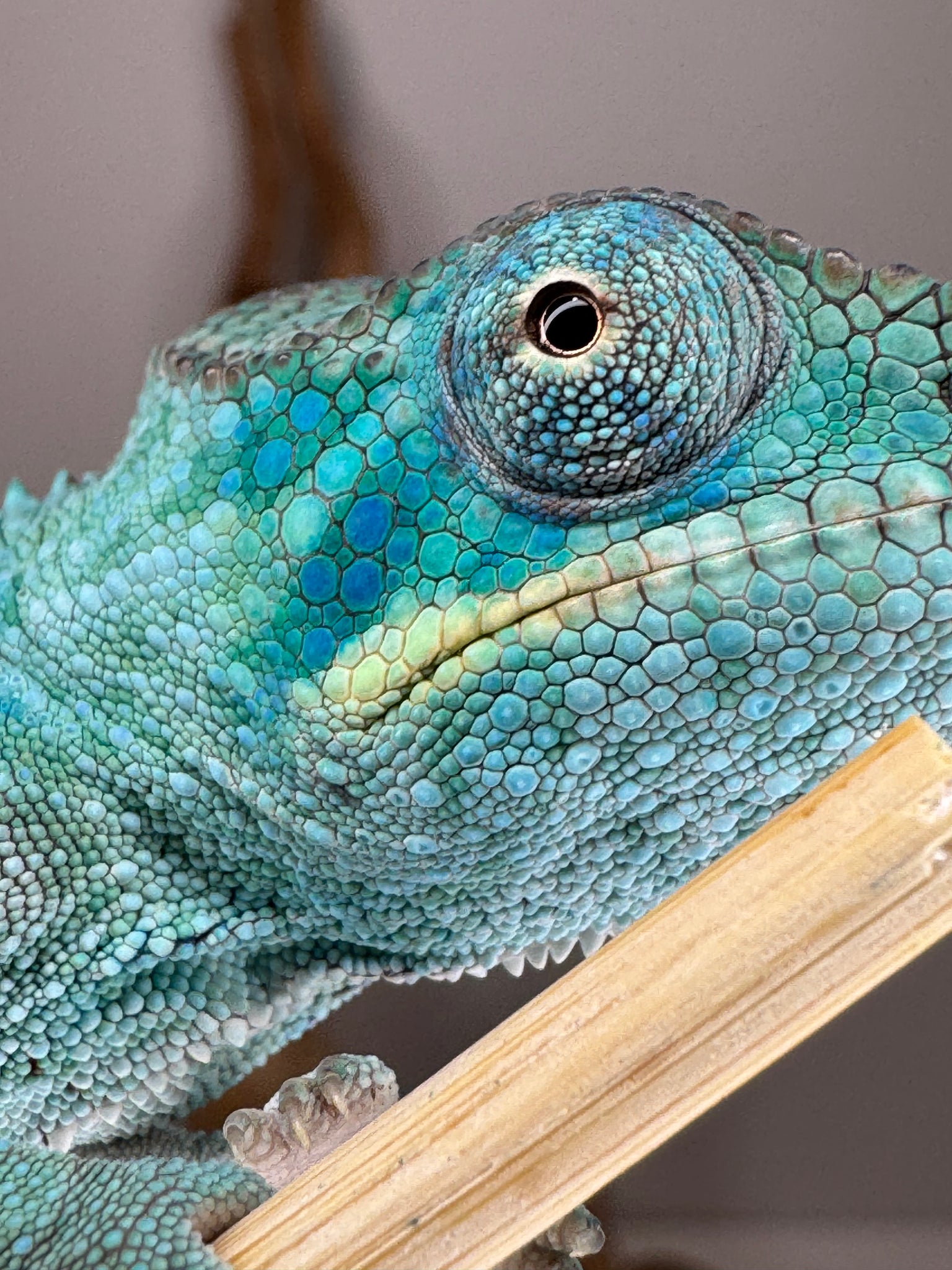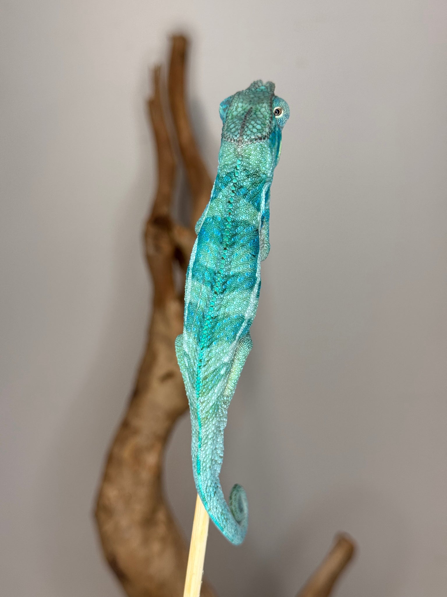 This young Ambanja Panther Chameleon is already turning heads with unbelievable blues and turquoise undertones, accented by hints of green. Though he’s still growing, his potential is undeniable. As he matures, expect his colors to deepen into the rich Avatar blues this bloodline is famous for—a true blue dream in the making!