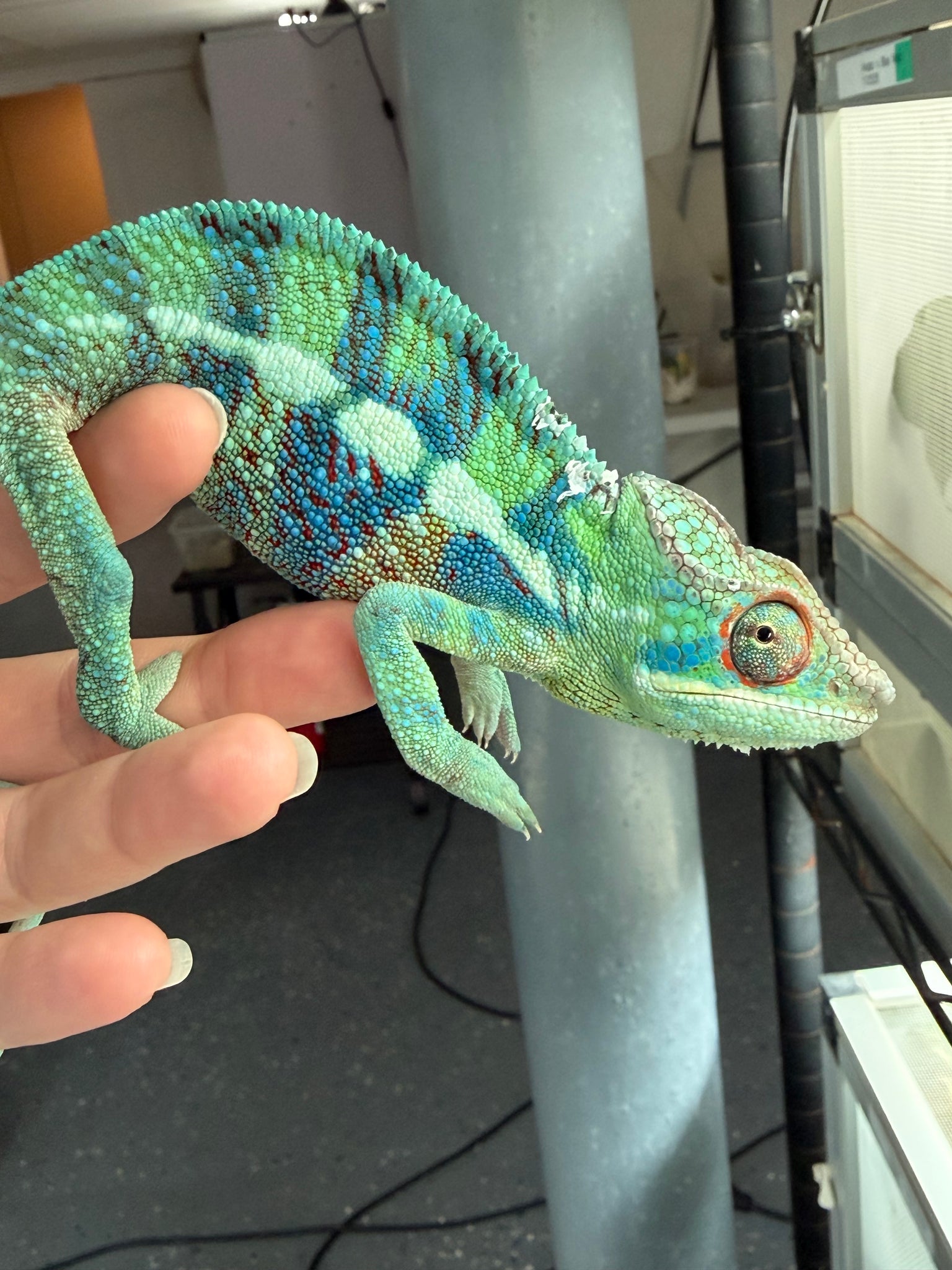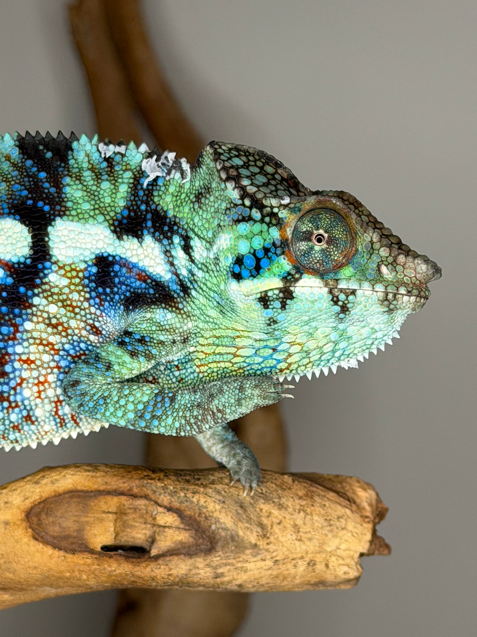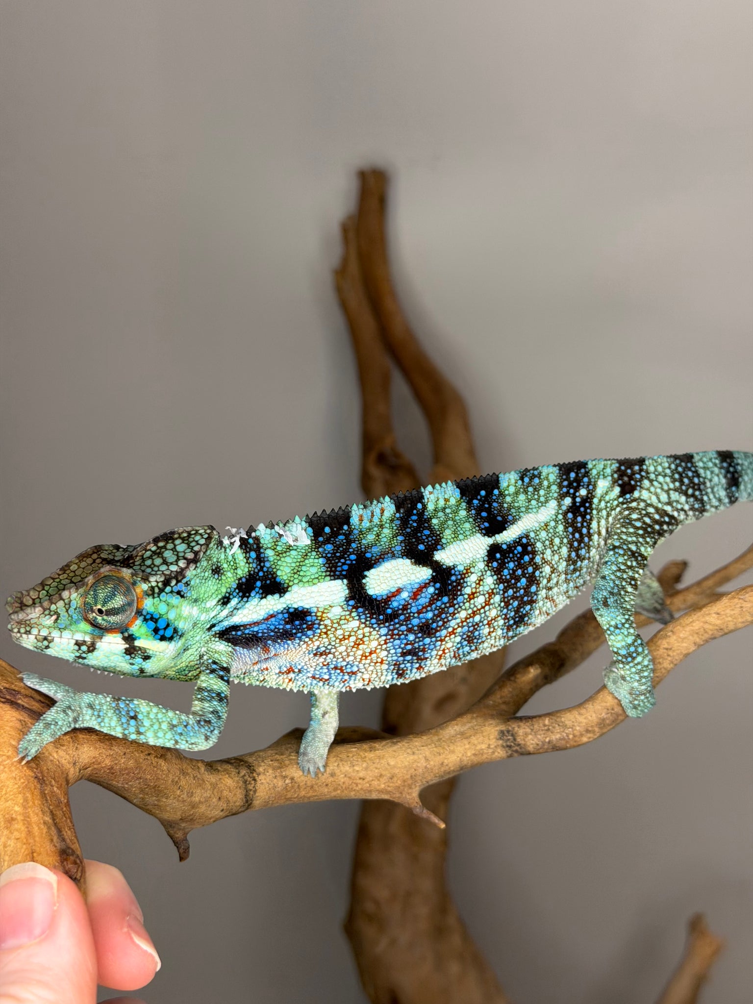 This Ambanja Panther Chameleon from FramsChams is already stepping into the bold, high-contrast look this sought-after locale is famous for. Layers of developing cool blues are emerging over rich, vibrant greens, with hints of deepblue/purple peeking through. He carries himself with confidence and awareness, offering plenty of personality while remaining engaging and enjoyable to observe.