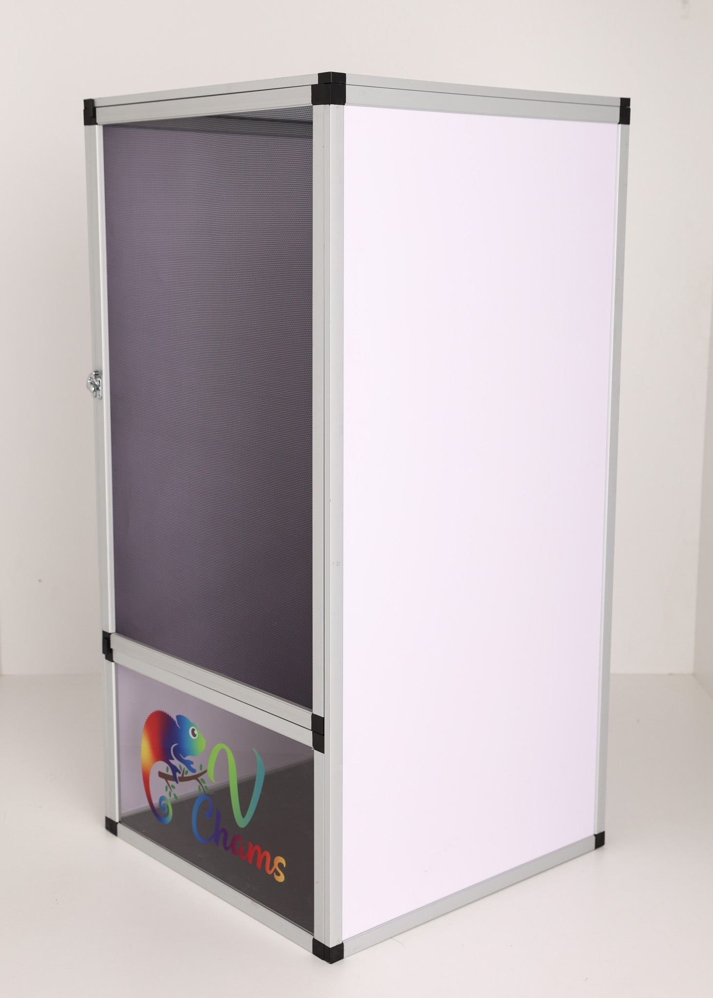 Designed by Vivid Chameleons & Reptile Supplies to exclusively customized to the needs of Chameleons. The front door, top, and back are made with duable, anti-rust, heavy-duty aluminum mesh screen while left and right side are made of white PVC. The chameleon will have a lot of airflow for the right ventilation and humidity level.