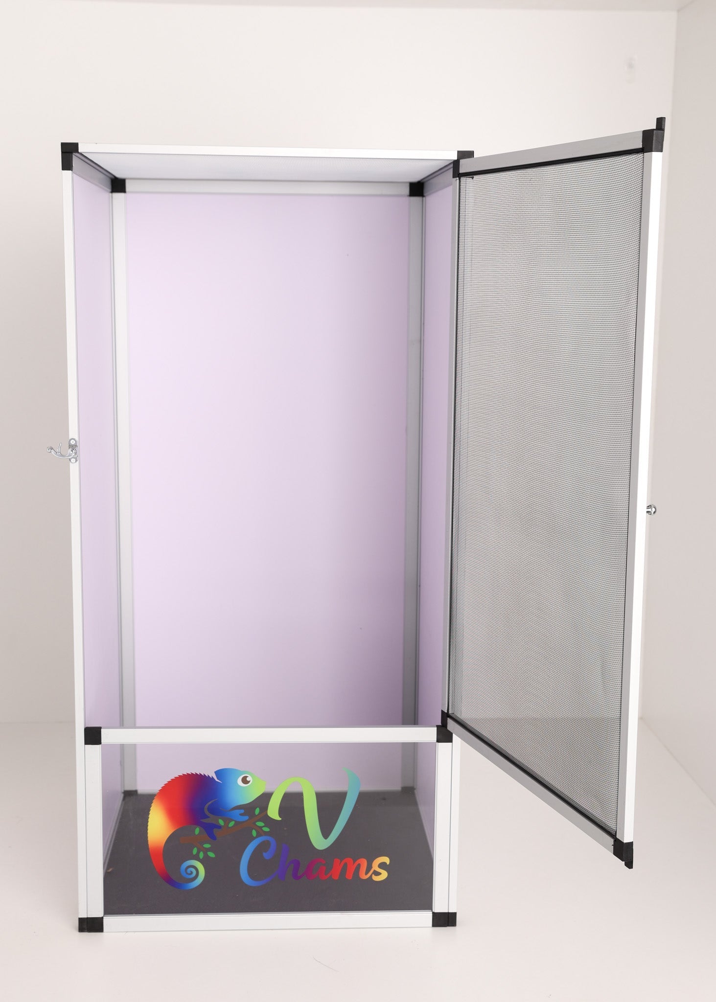 Designed by Vivid Chameleons & Habitats to exclusively customized to the needs of Chameleons.  The front door, top, and back are made with duable, anti-rust, heavy-duty aluminum mesh screen while left and right side are made of white PVC.  The chameleon will have a lot of airflow for the right ventilation and humidity level.