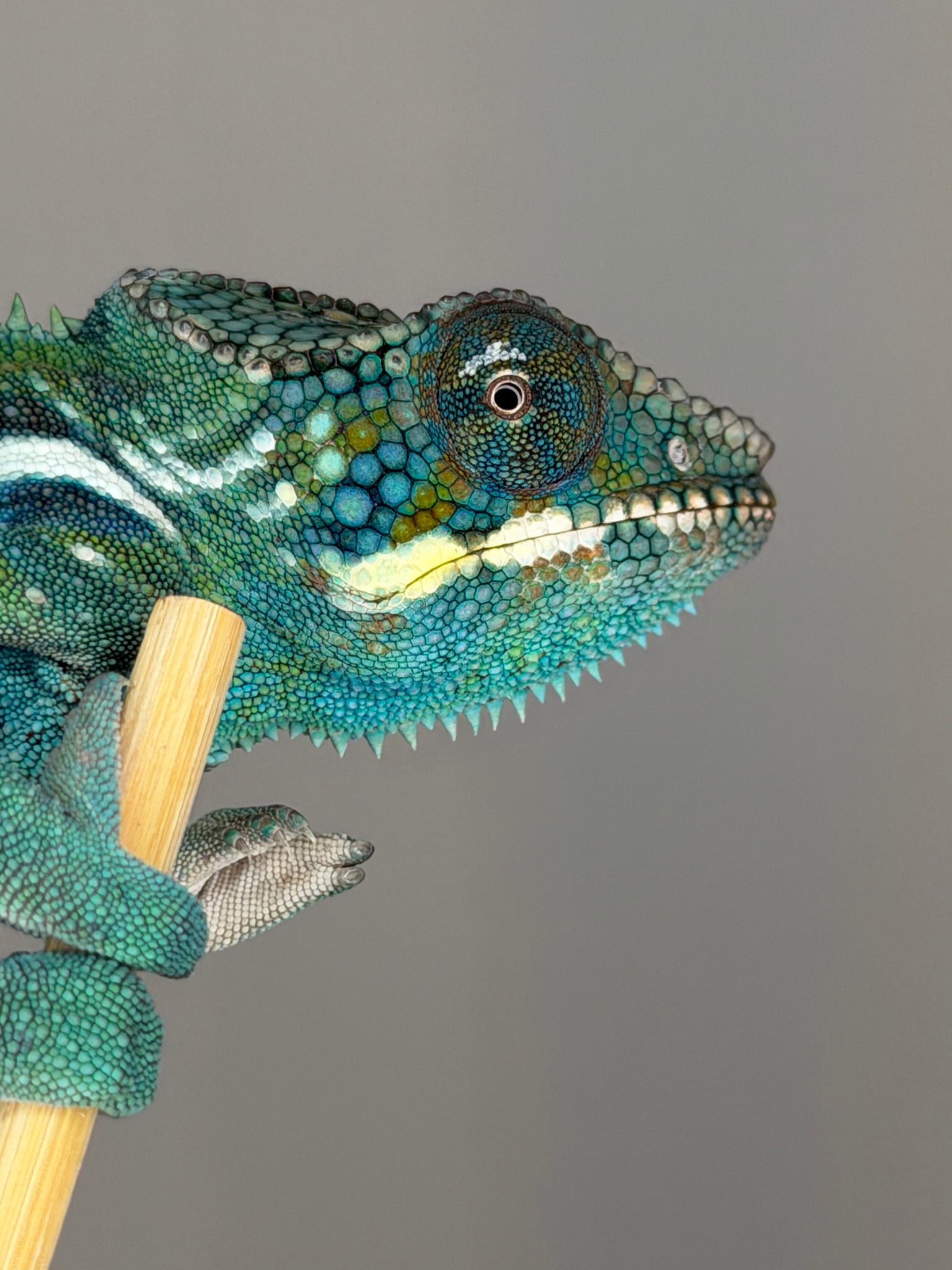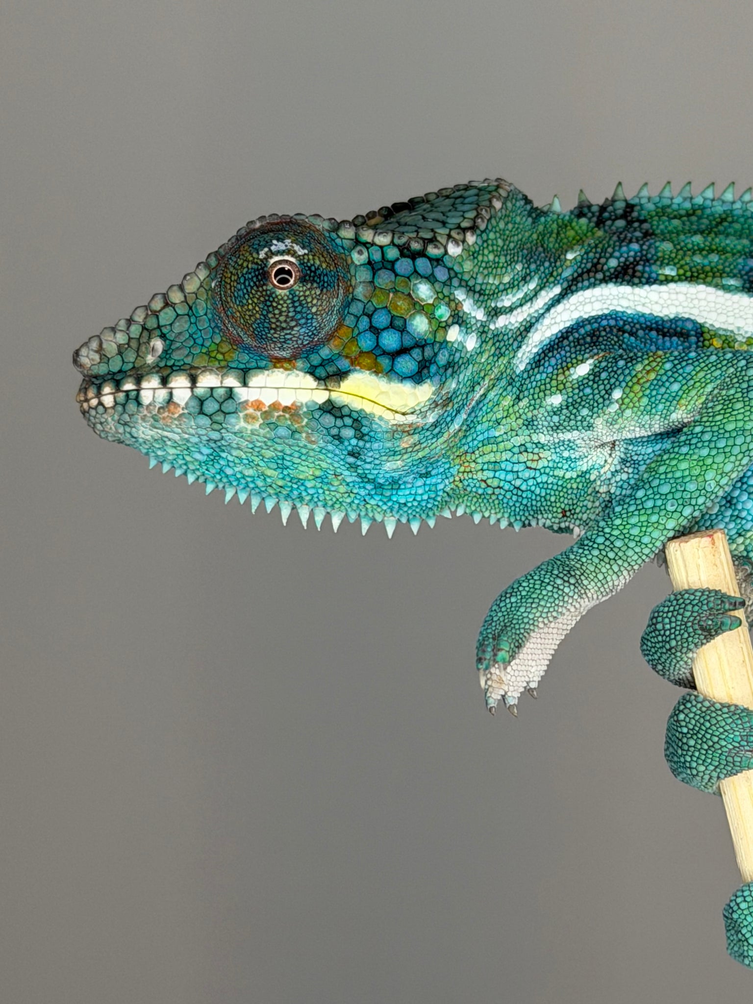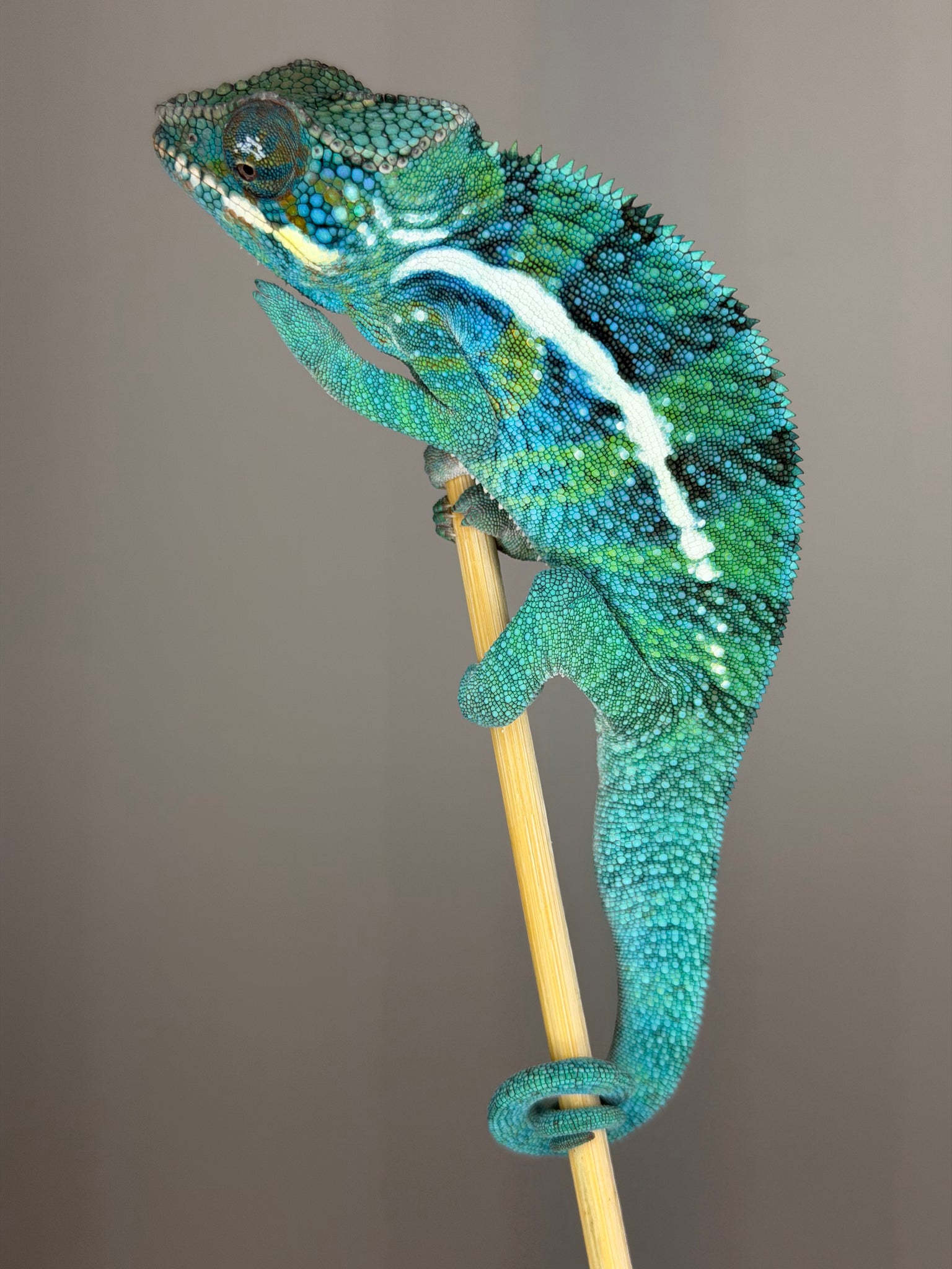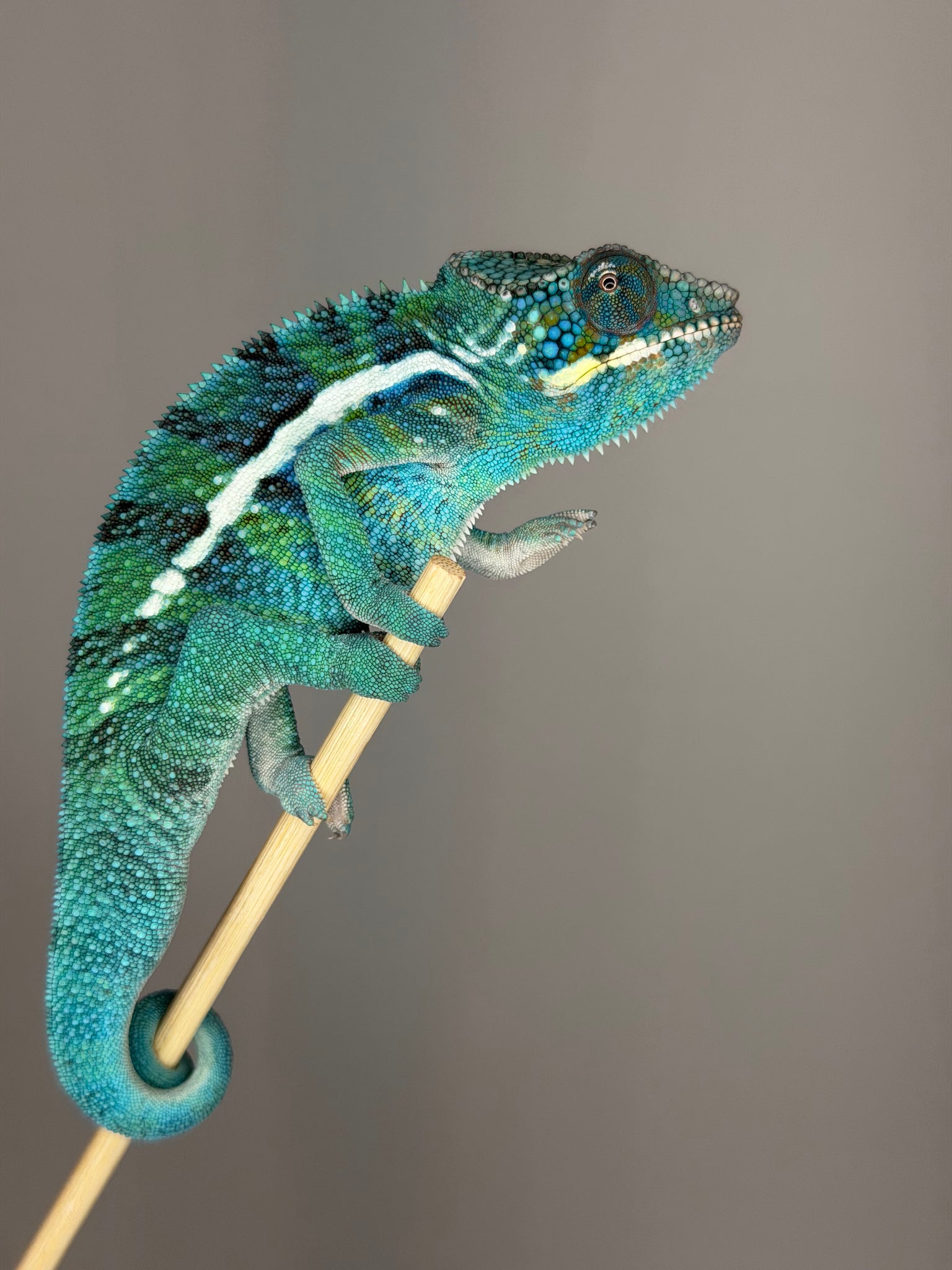 Meet this eye-catching Ambanja × Ambilobe hybrid Panther Chameleon, showcasing beautiful color saturation with a striking blue-bar base and bright teal highlights. While he is a bit shy at first, he has excellent potential and settles in nicely with consistent, gentle care.