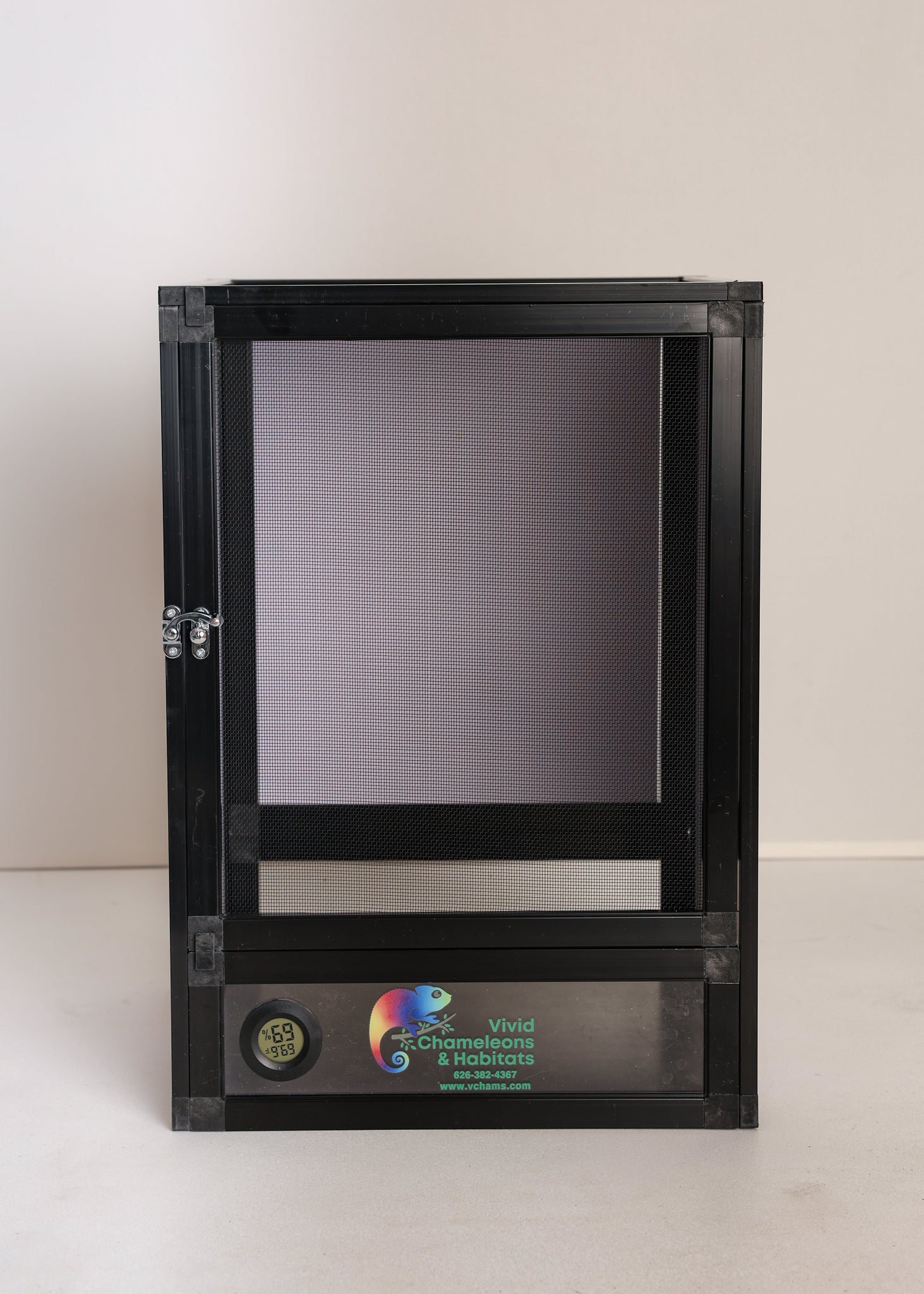Designed by Vivid Chameleons & Habitats to exclusively customized to the needs of Chameleons. The front door, top, and back are made with duable, anti-rust, heavy-duty aluminum mesh screen while left and right side are made of white PVC. The chameleon will have a lot of airflow for the right ventilation and humidity level.