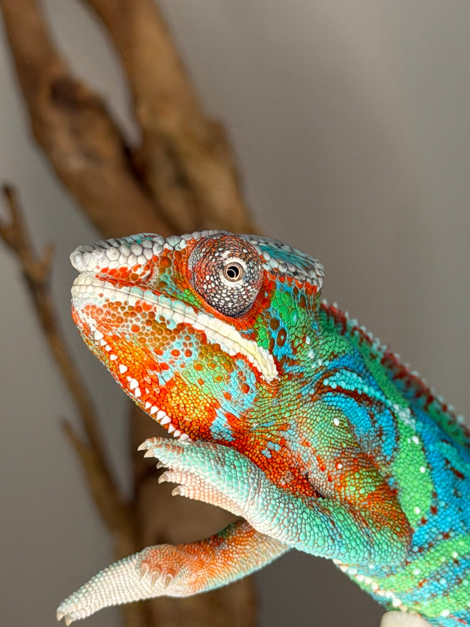Male panther chameleons undergo an amazing color transformation as they mature. At 3-4 months (the typical age sold on our site), their colors are just beginning to develop.