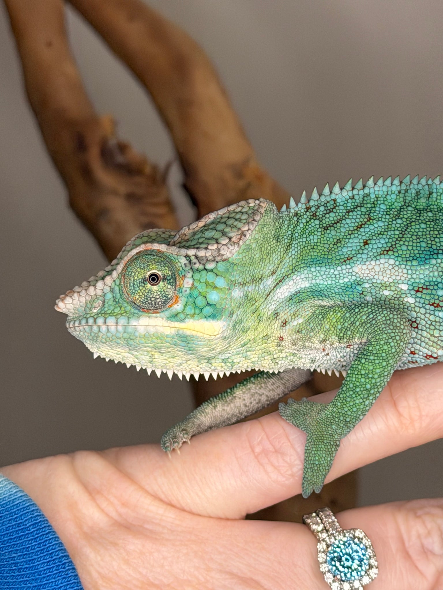Beyond his looks, he has an amazing personality—curious, calm, and confident in his enclosure. He’s enjoyable to observe and easy to work with, making him a wonderful addition for anyone looking for a visually impressive yet manageable panther chameleon.