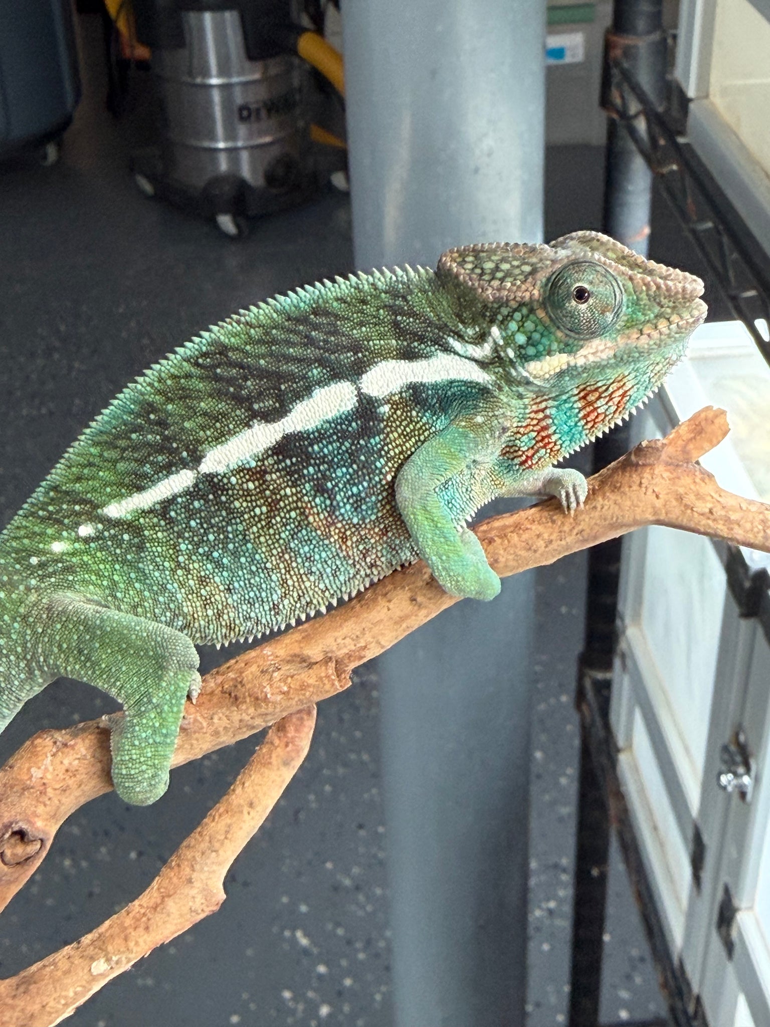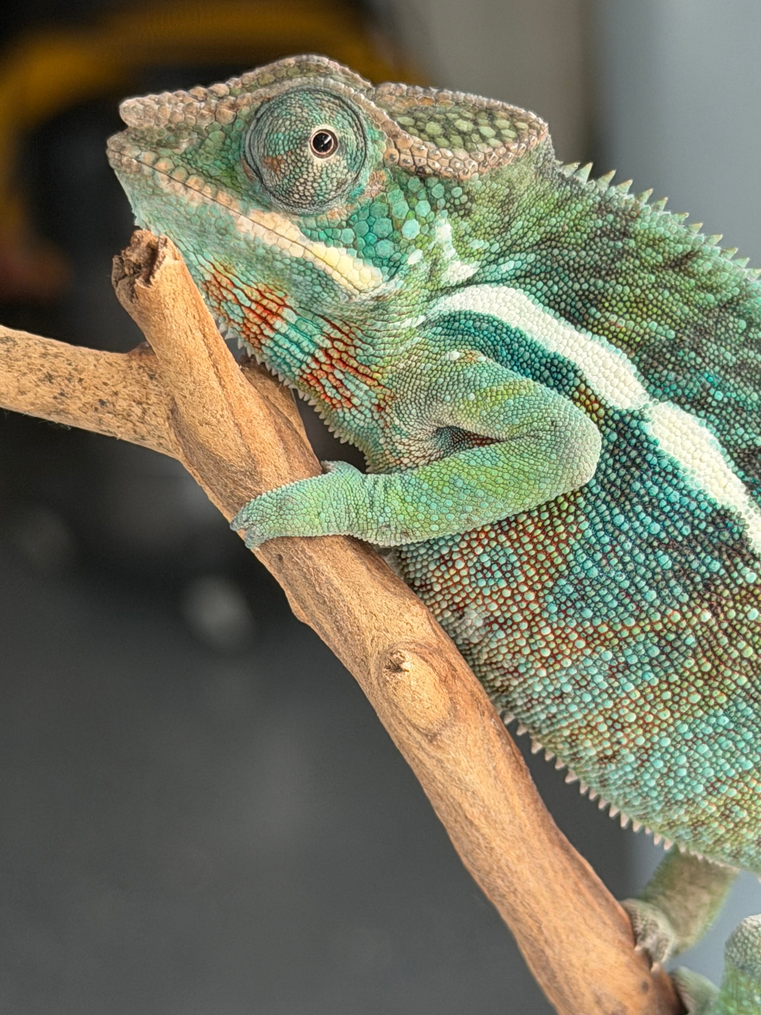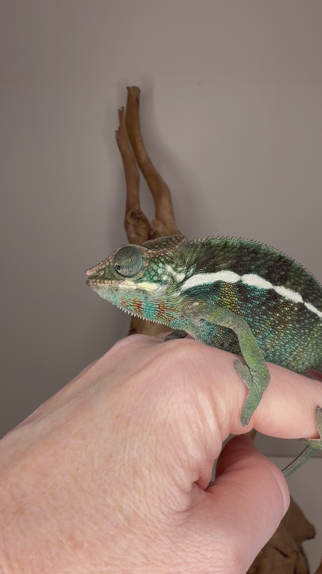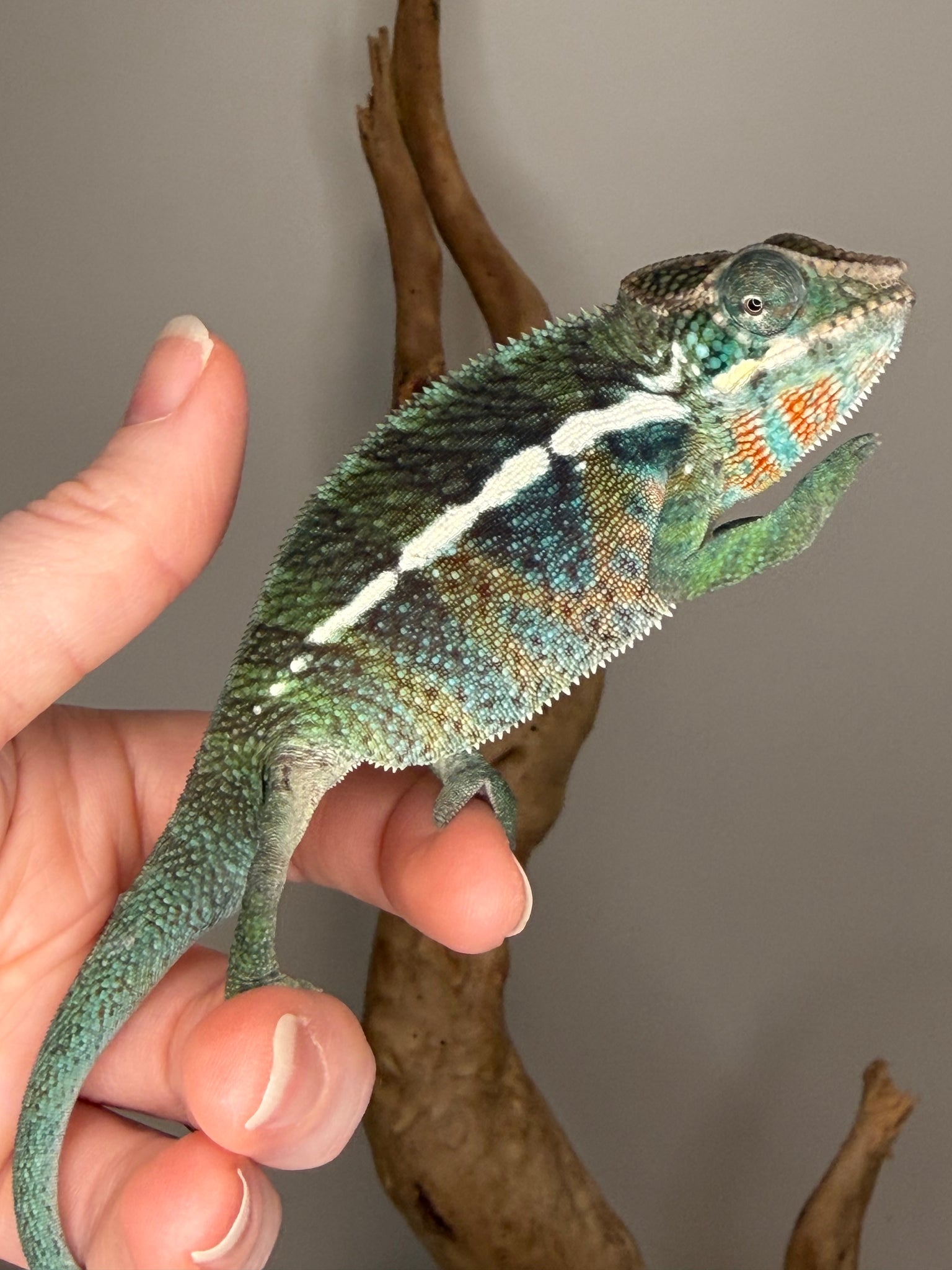 This young male Ambilobe Panther Chameleon from FramsChams is healthy, curious, and already glowing with deep jewel-toned color that’s ready to pop. Rich teals, bold reds, and emerging blues are developing quickly, paired with an alert, confident personality. He is active and inquisitive in his enclosure, yet remains calm and handleable when interacted with.