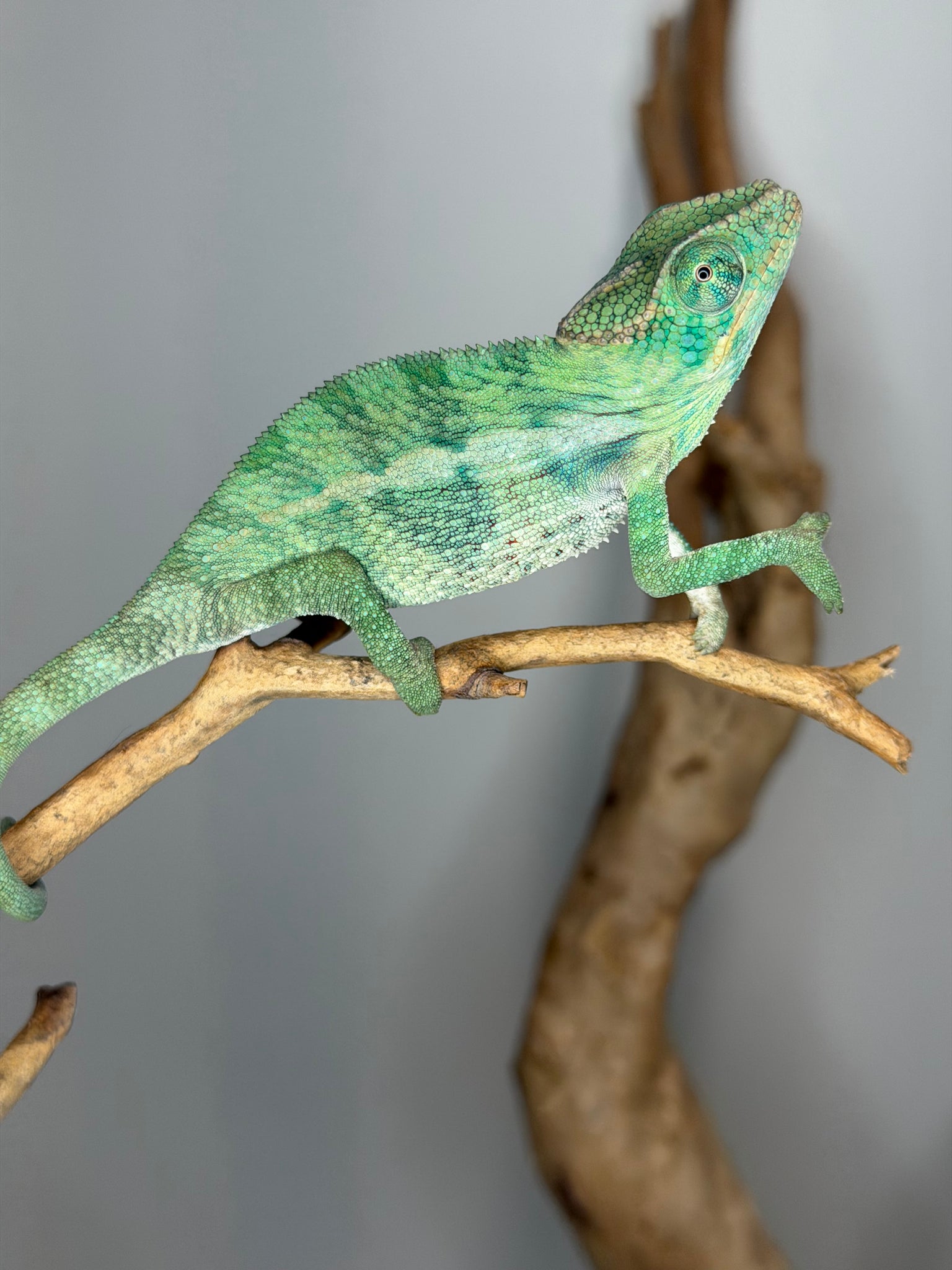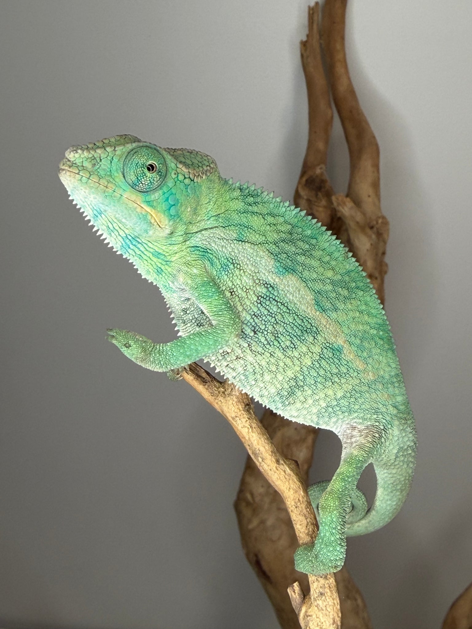 This slightly older male Ambilobe Panther Chameleon from FramsChams is calm, healthy, and already showing stunning coloration — vibrant teals, rich reds, and subtle blues. With strong genetics from the renowned Flash Jr. x Aslan pairing, he’s a beautiful, easygoing addition to any collection.