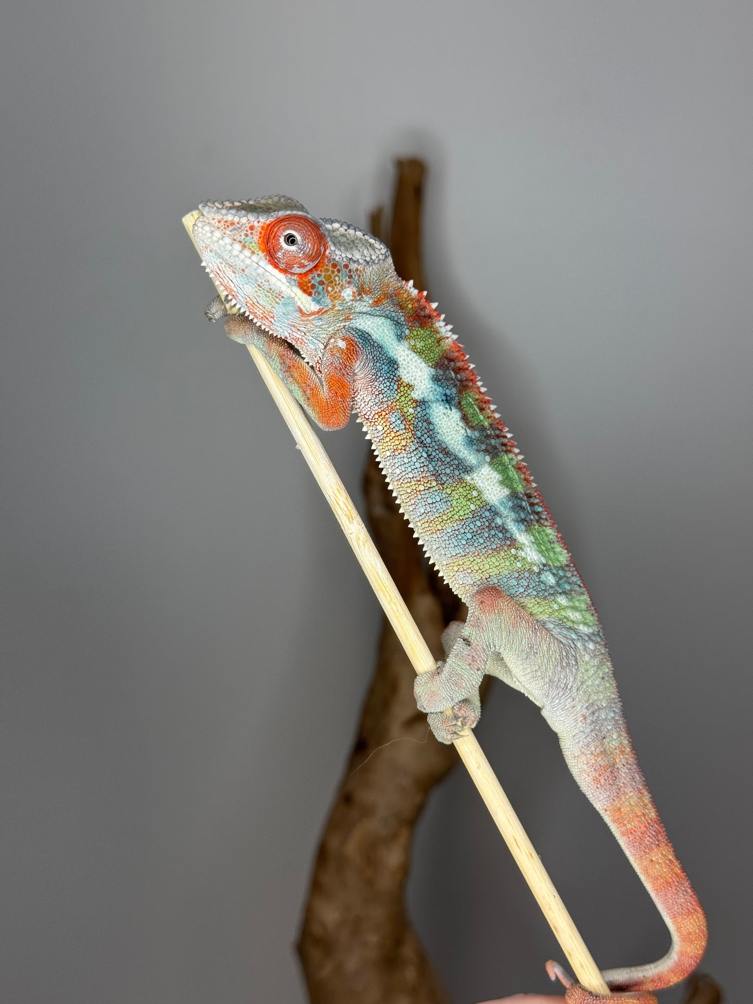 Male Ambilobe Panther Chameleon from Flash Jr. x Aslan line showing bright reds and blues