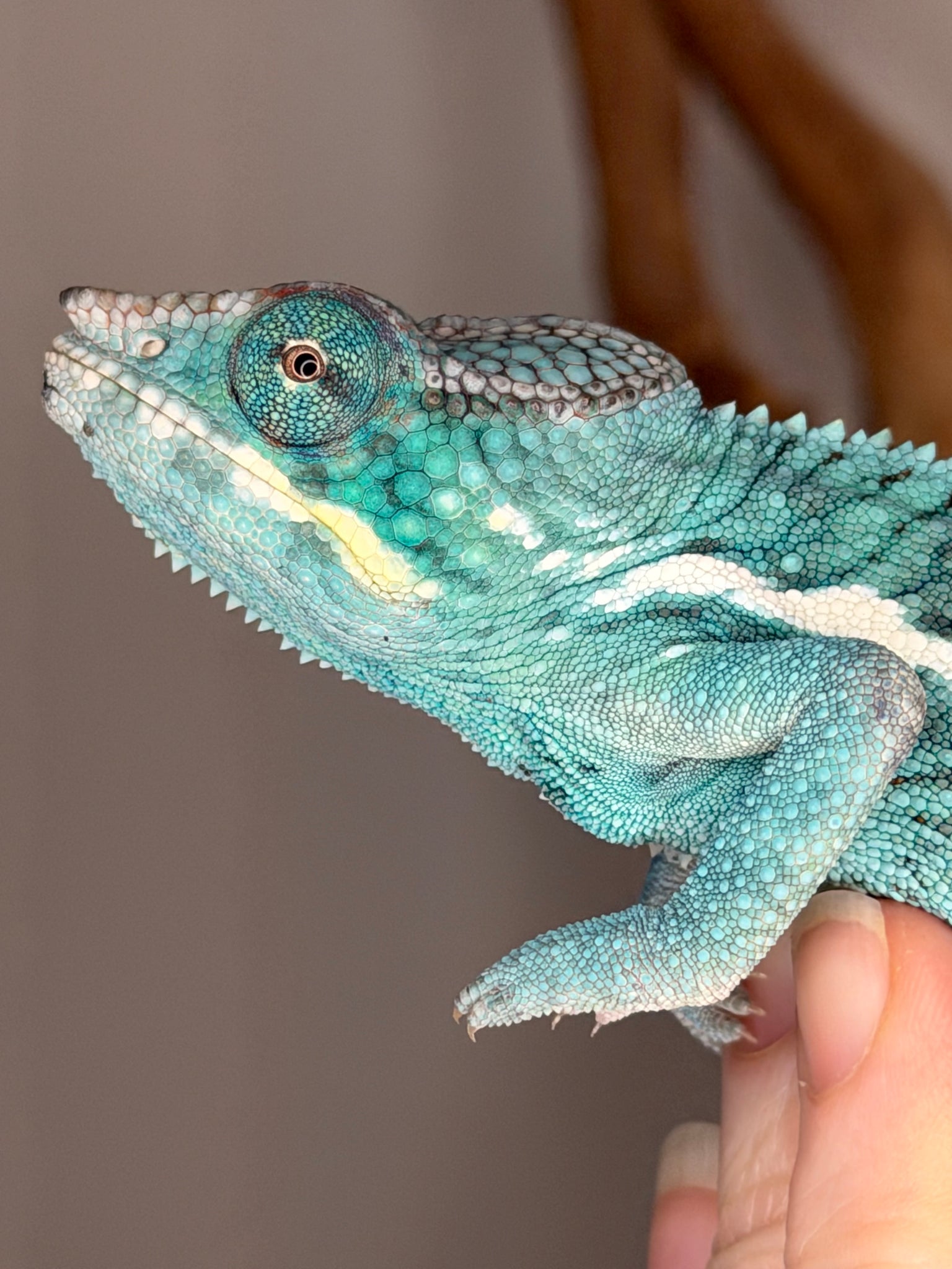 This young Nosy Be Panther Chameleon is already showing the soft sky-blue tones this classic locale is known for. Calm, gentle, and quietly curious, he’s a pleasure to observe and is settling in beautifully — a lovely example of a well-started juvenile.