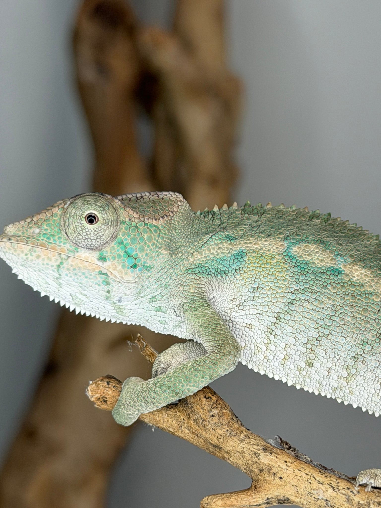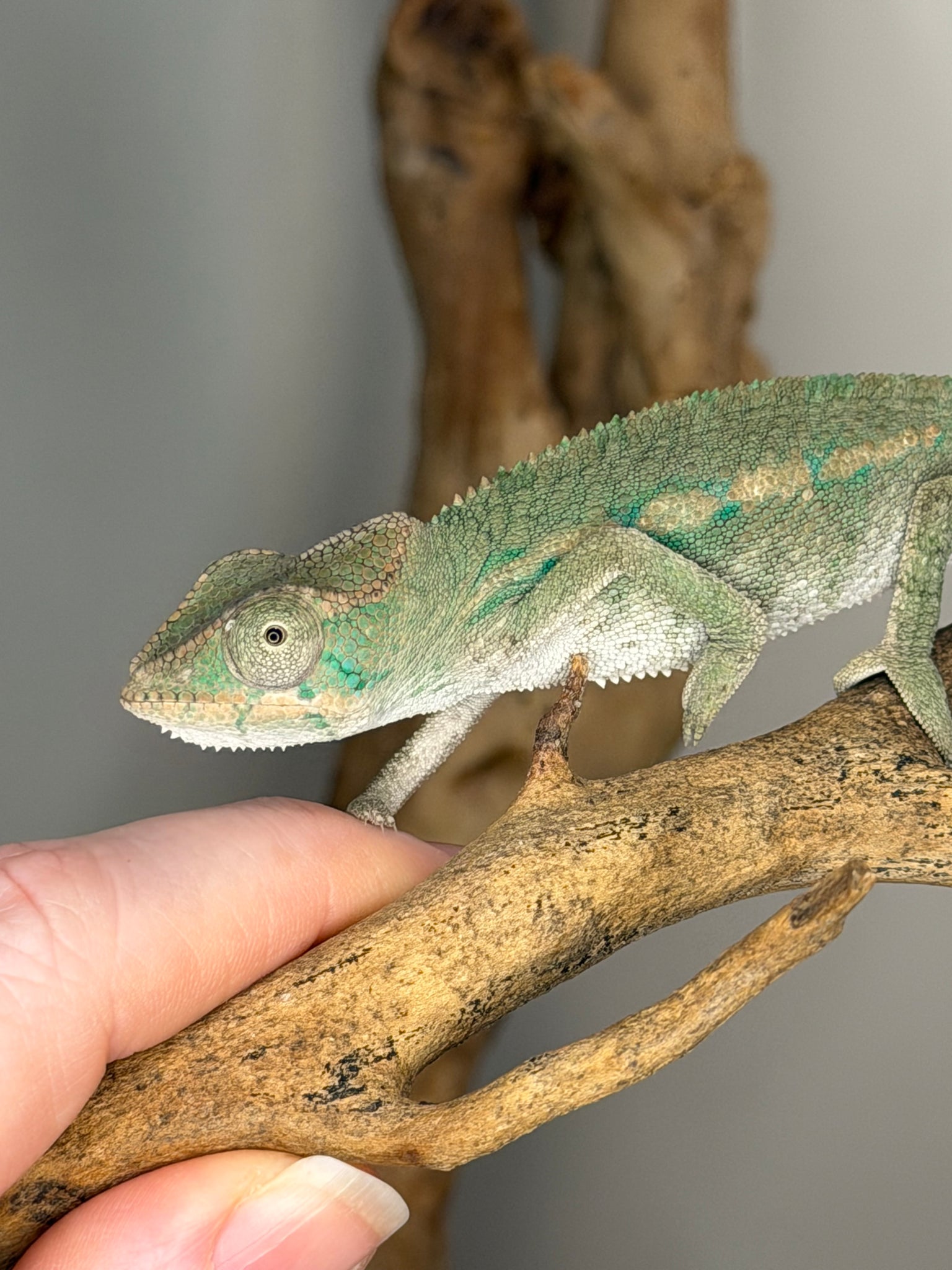 This young male Ambilobe Panther Chameleon from FramsChams is calm, healthy, and already showing hints of his future brilliance — teals, reds, and subtle blues. With strong genetics from the renowned Flash Jr. x Aslan pairing, he’s destined to be a standout in any collection.