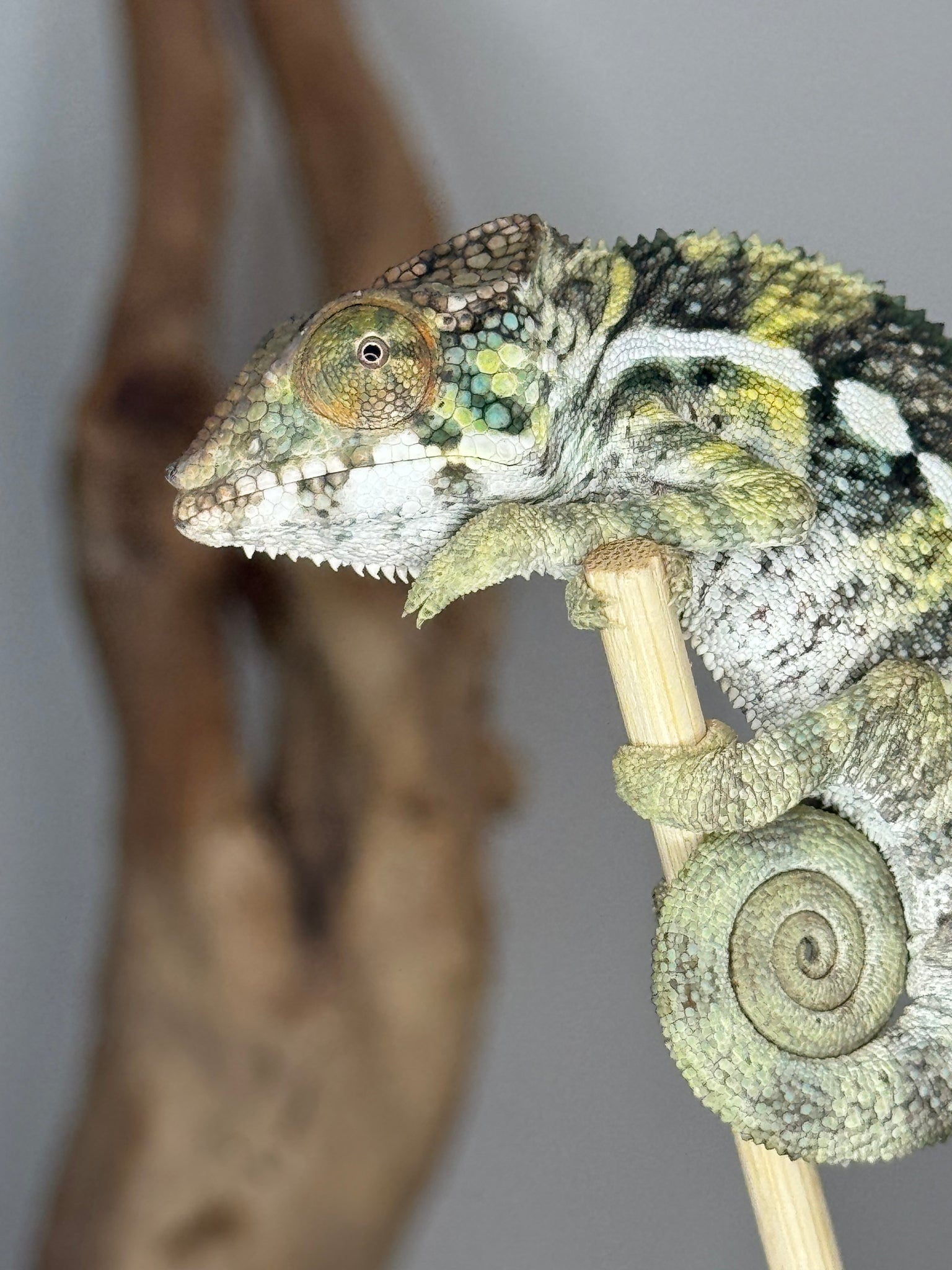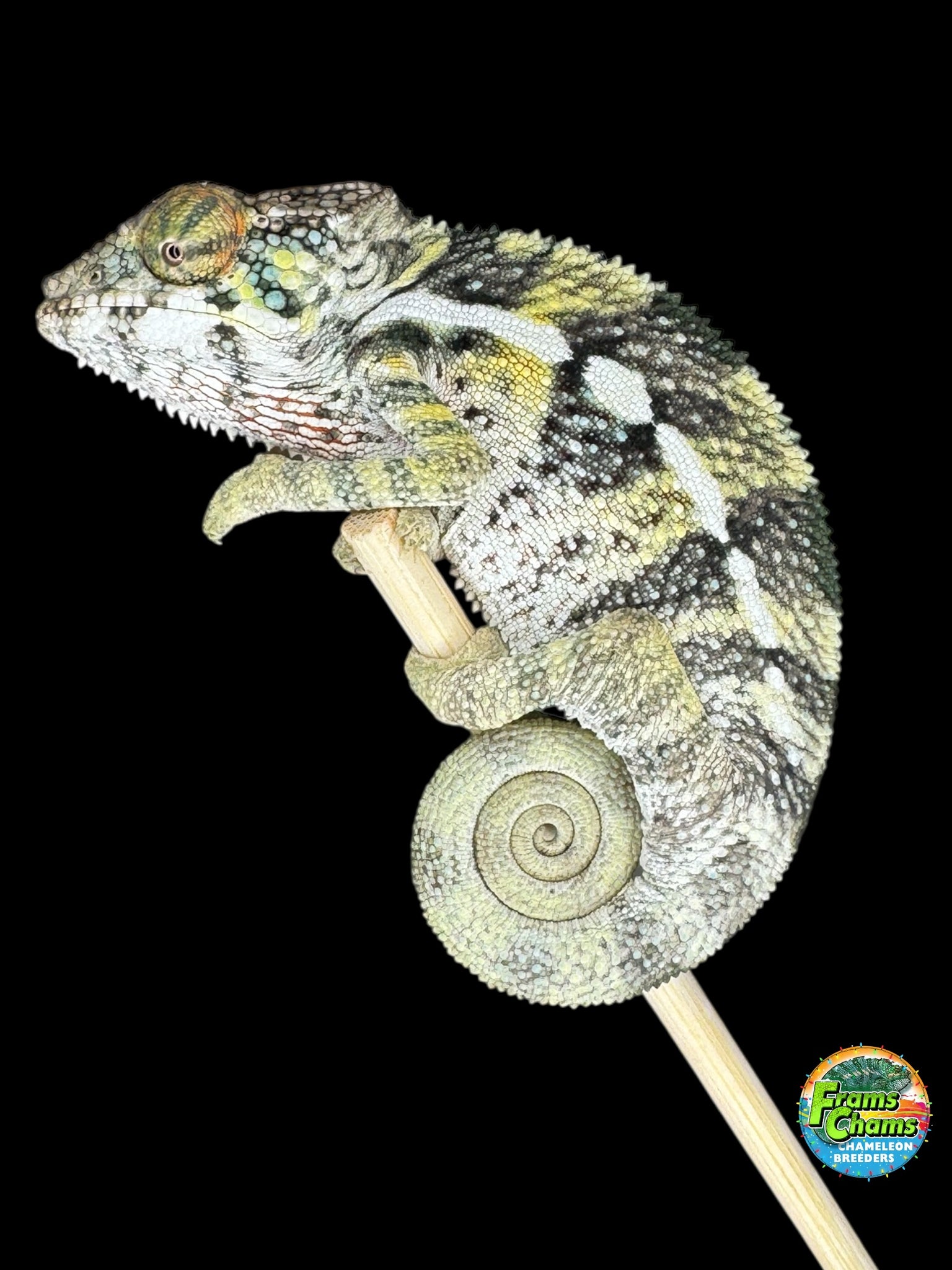 This chameleon is thriving on a nutritious diet of silkworms, crickets, and occasional hornworms — all gut-loaded and dusted with calcium and vitamins for healthy growth and vivid color. At FramsChams, we only feed the best to raise strong, healthy, and beautiful chameleons.