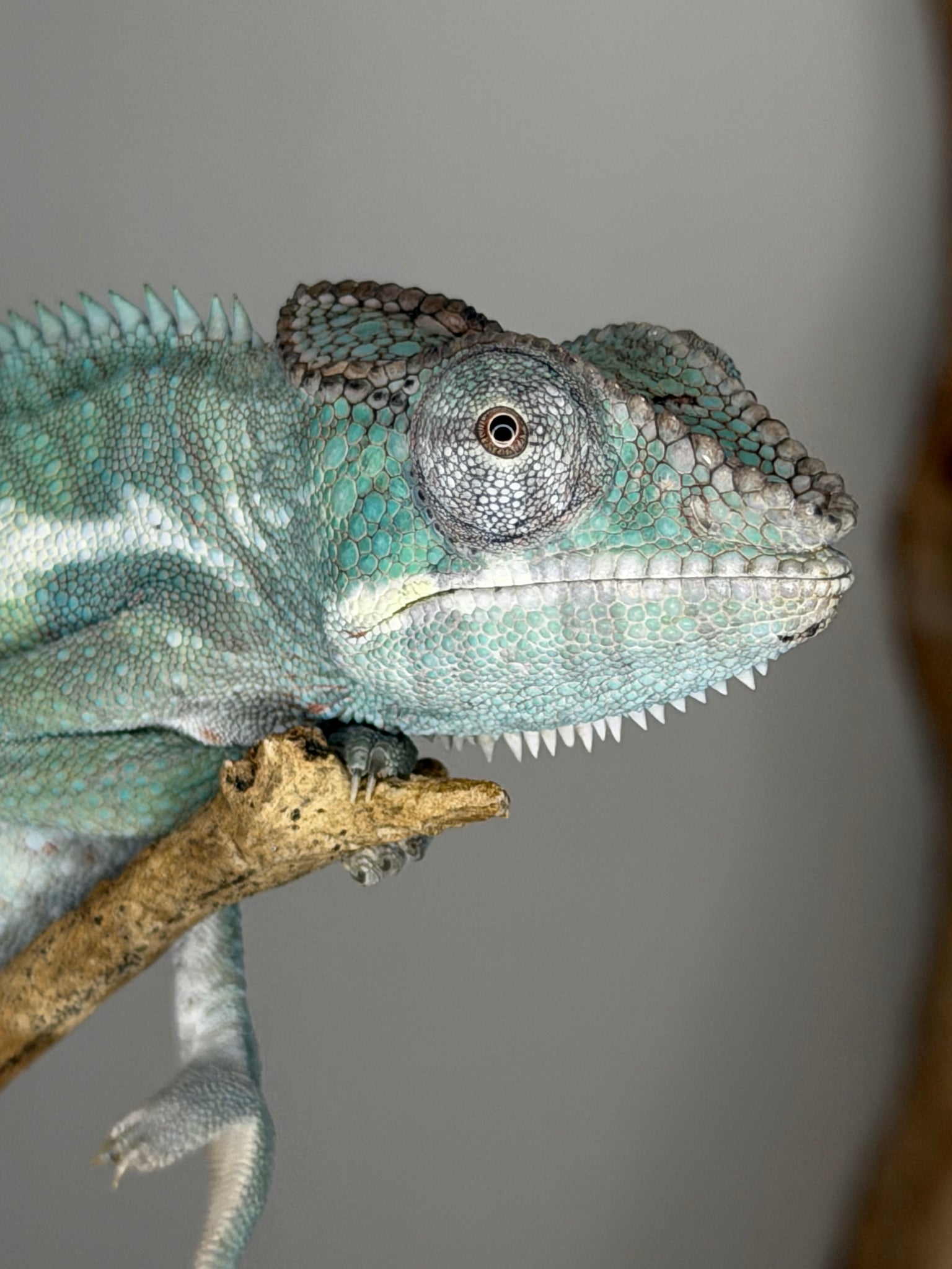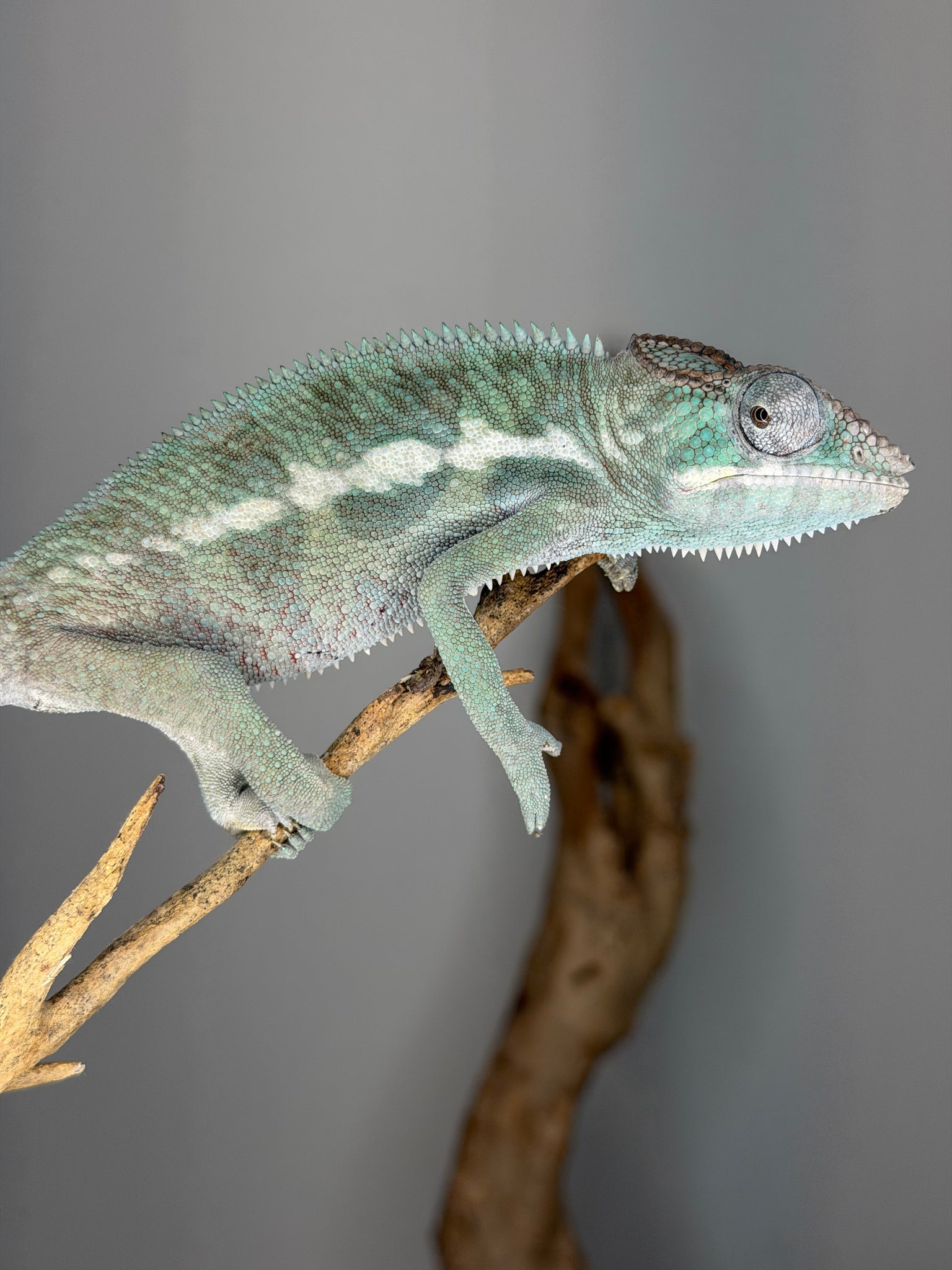 A calm, mature-looking chameleon with developed color and a grounded personality—perfect for someone looking for a more settled, visually impressive animal ready to enjoy right away.