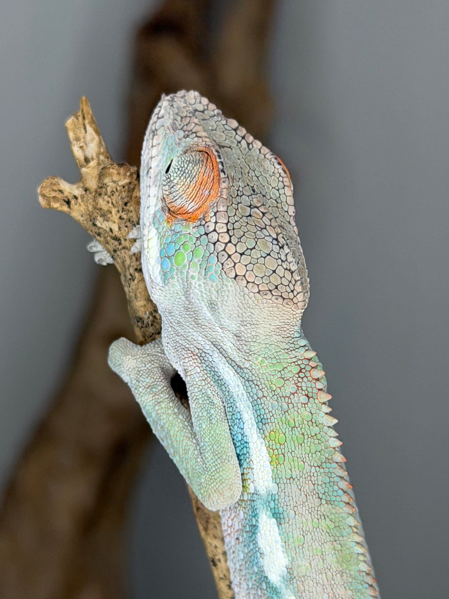 This young male Ambilobe Panther Chameleon from FramsChams is calm, healthy, and already showing hints of his future brilliance — teals, reds, and subtle blues. With strong genetics from the renowned Flash Jr. x Aslan pairing, he’s destined to be a standout in any collection.