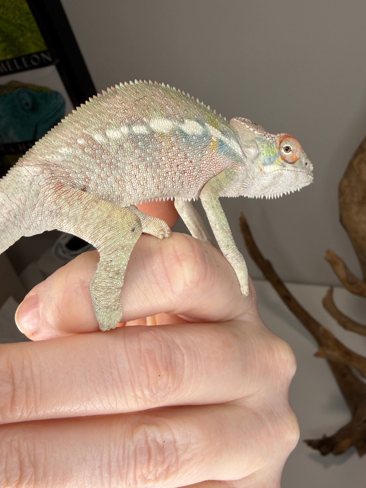 Meet this calm male Ambilobe Panther Chameleon – Aslan x Flash Jr. Juvenile! 🌈