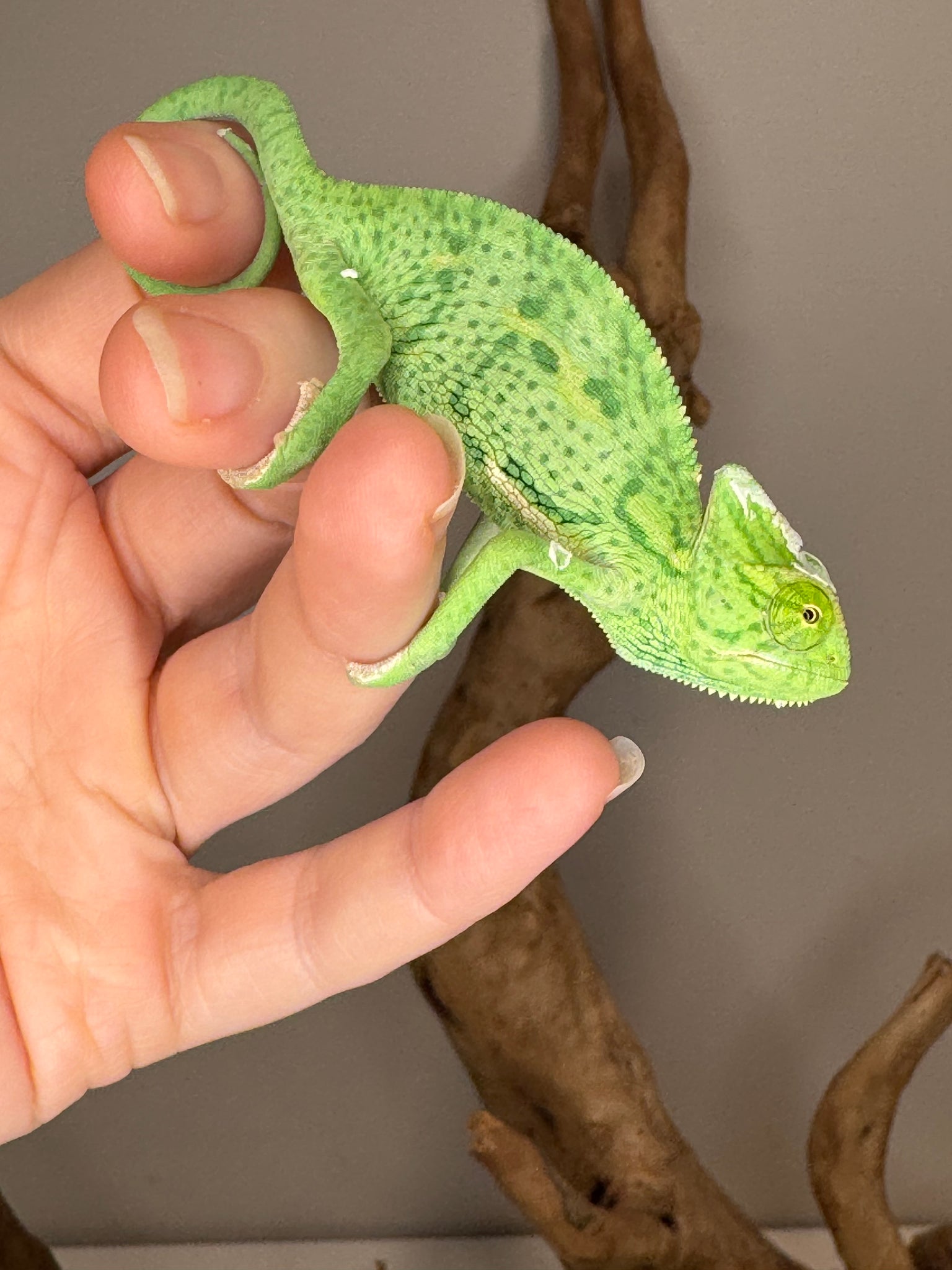 Daily handling ensures our chameleons grow confident, calm, and curious, creating a friendlier, easier-to-handle pet that adapts smoothly to its new home.